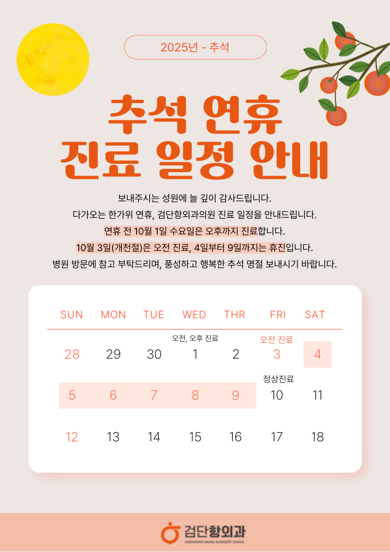 추석 전 10월 1일 수요일은 오후까지 진료합니다. 내원에 참고해주시기 바랍니다.